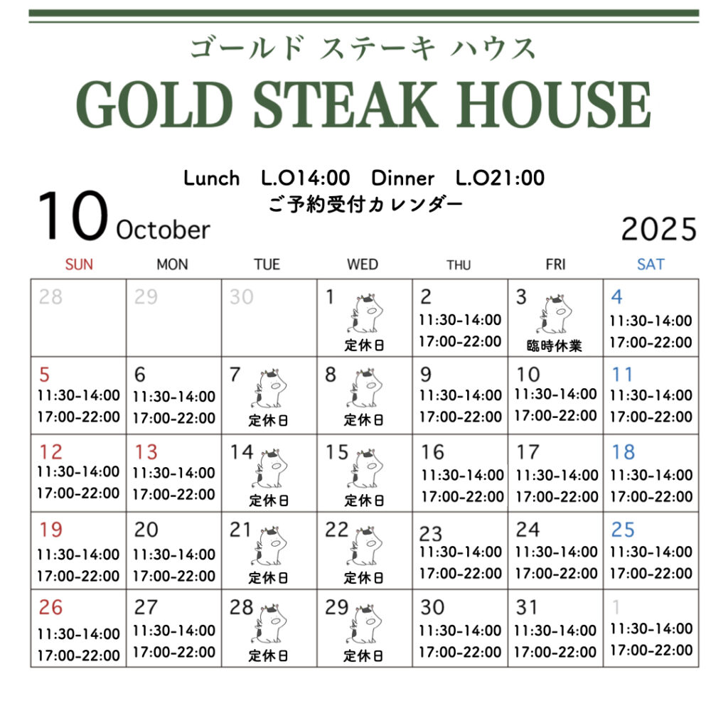 10月営業日 ご予約受付カレンダー ゴールドステーキハウス